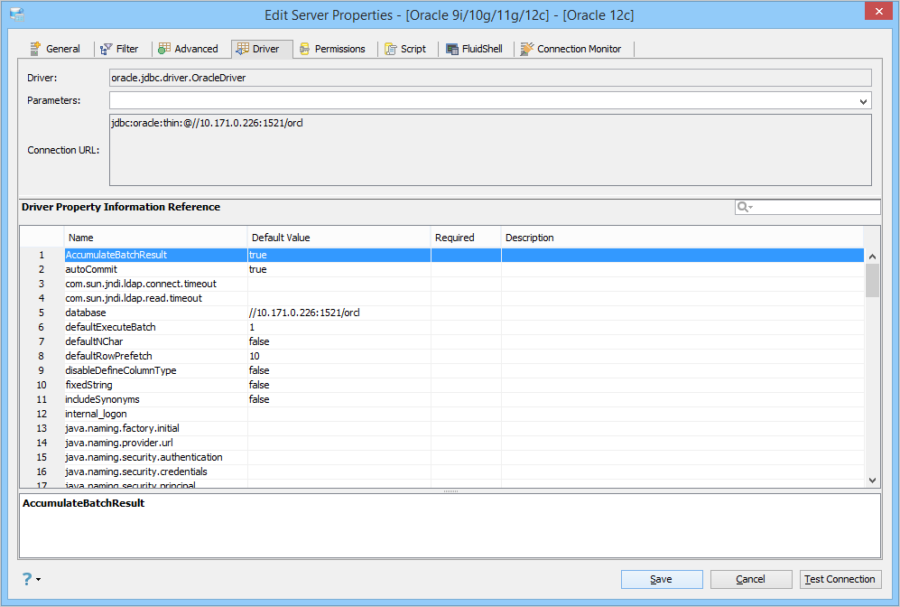 - Driver Parameters Quickfilter: This option is to allow a user to search JDBC parameters that a user might want to use in establishing a connection.