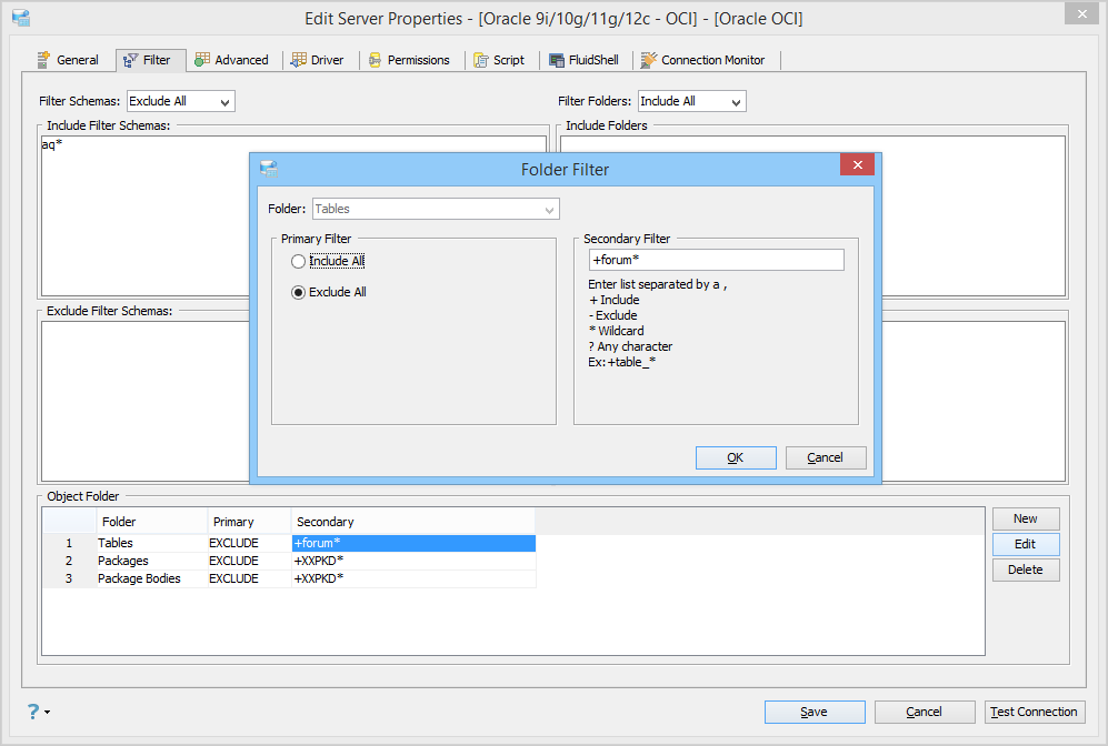 The filter shown below is set to exclude all databases except those that start with "aq". This is similar to the above example where all schemas, except the XXPKD schema, are excluded. Then, there is an "Object Folder" filter on the Tables folder, which excludes everything except those that start with "forum".