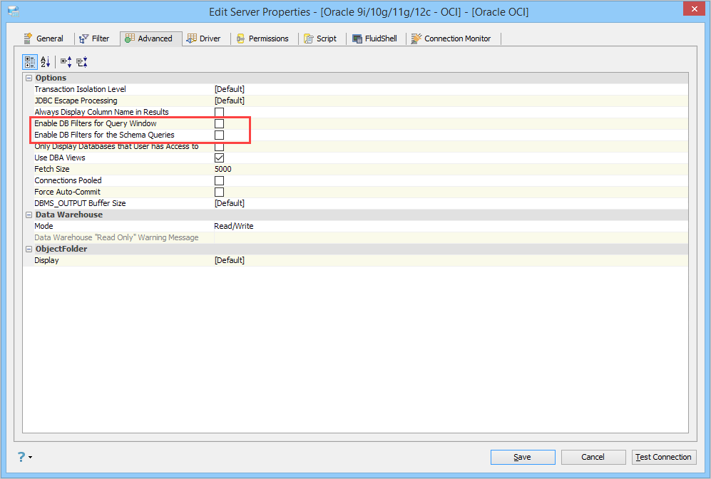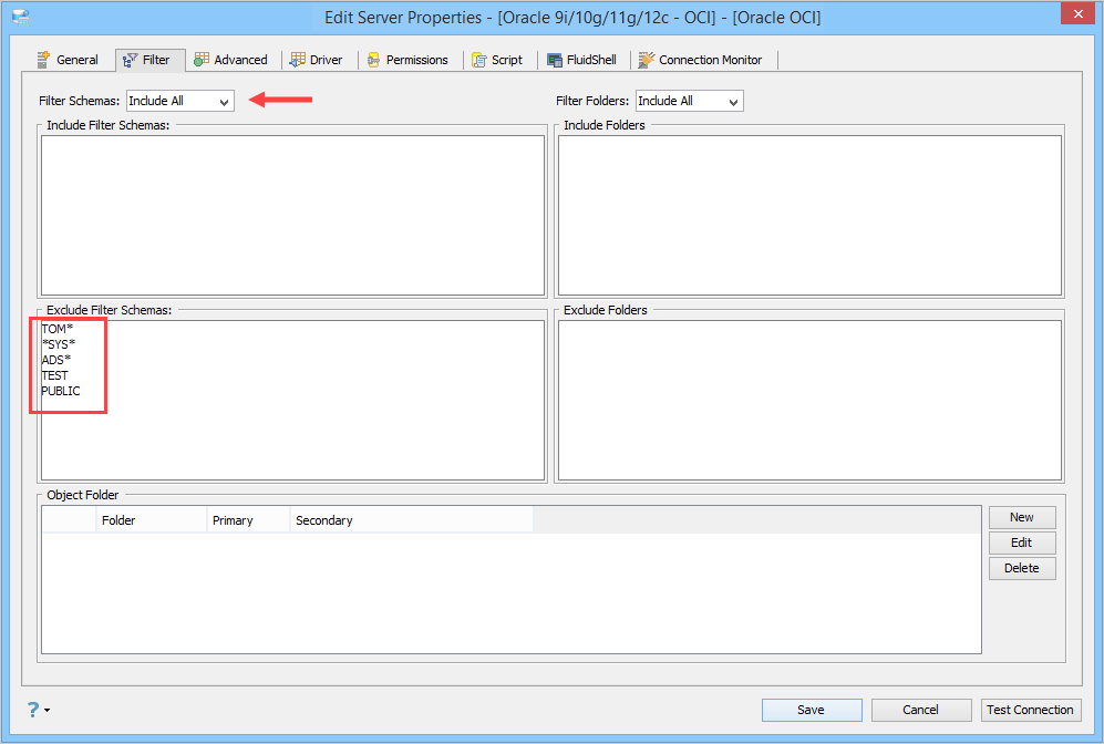 • Object Folder filter works on individual folders inside a particular Schema. The user can define filters for each of the Tables, Views, etc. folders.