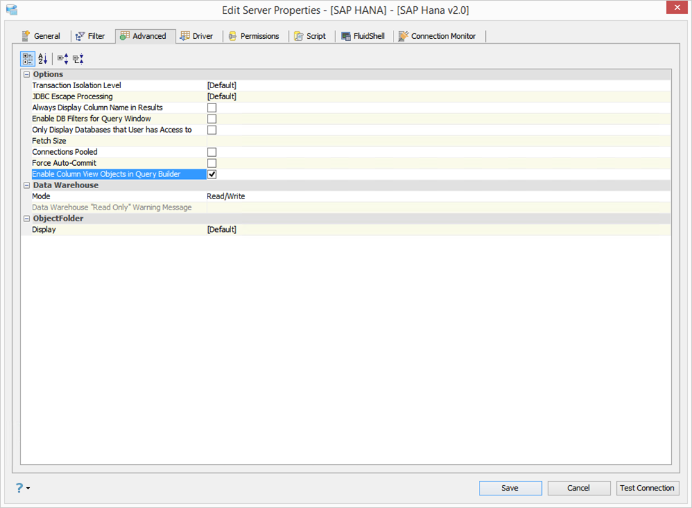 • Enable Column View Objects in Query Builder: Enables/Disables full support for Column View objects in Query Builder.