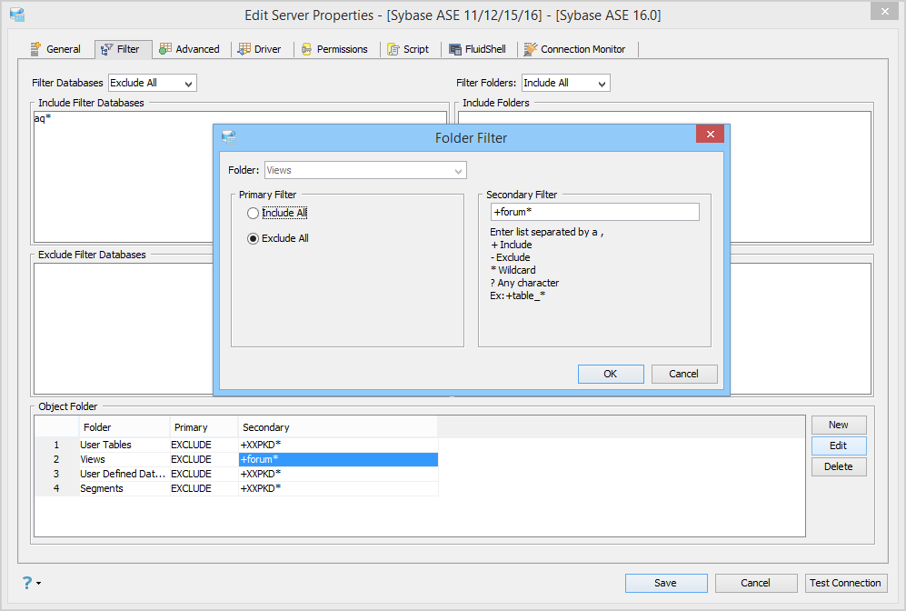 The filter shown below is set to exclude all databases except those that start with "aq". This is similar to the above example where all schemas, except the XXPKD schema, are excluded. Then, there is an "Object Folder" filter on the Tables folder, which excludes everything except those that start with "forum".