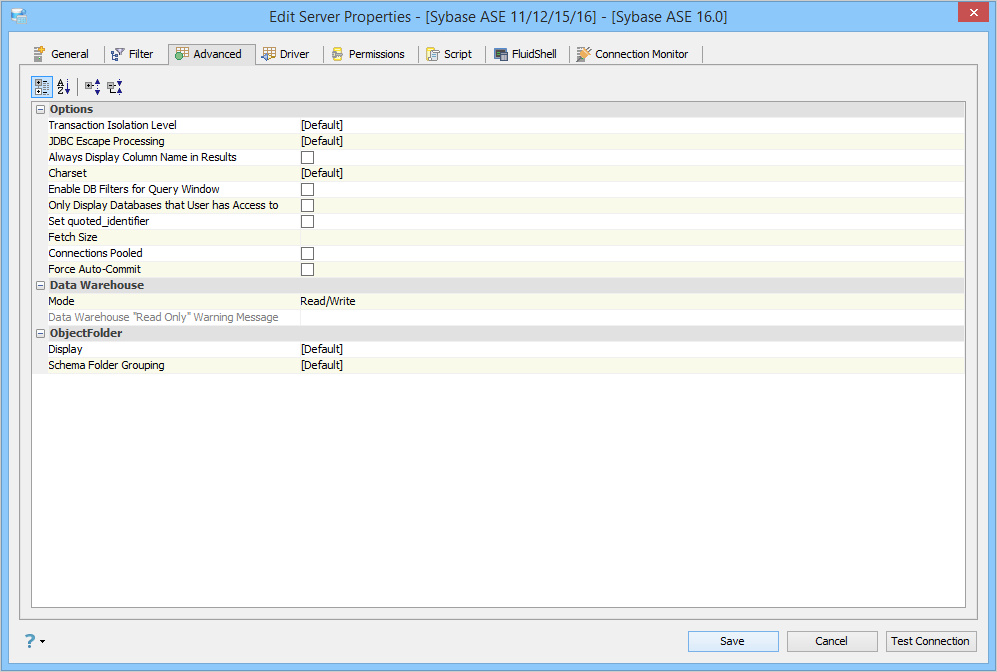 Edit the Server Properties to use Advanced Properties in Aqua Data Studio: