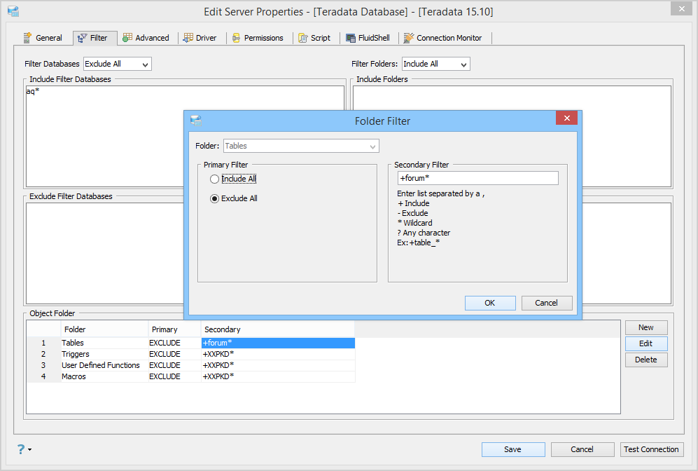 The filter shown below is set to exclude all databases except those that start with "aq". This is similar to the above example where all schemas, except the XXPKD schema, are excluded. Then, there is an "Object Folder" filter on the Tables folder, which excludes everything except those that start with "forum".