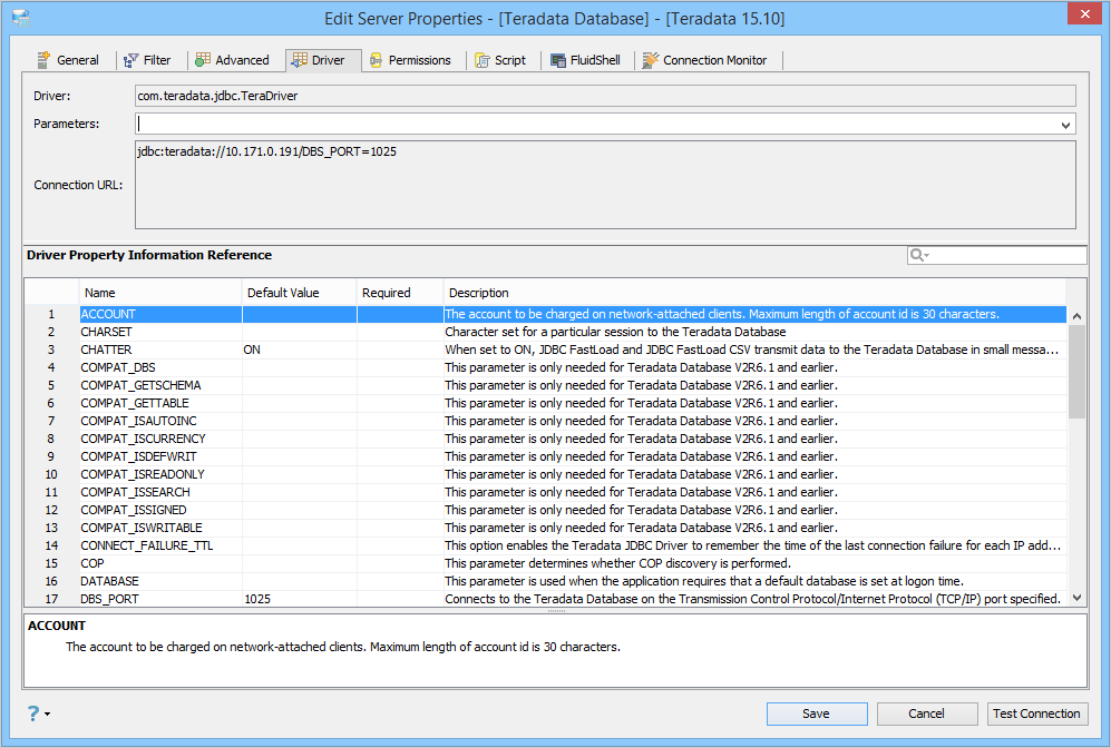 - Driver Parameters Quickfilter: This option is to allow a user to search JDBC parameters that a user might want to use in establishing a connection.