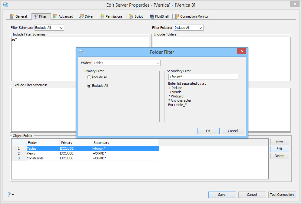 The filter shown below is set to exclude all schemas except those starting with "aq." This is similar to the above example where all schemas, except the XXPKD schema, are excluded. Then, there is an "Object Folder" filter on the Tables folder, which excludes everything except those that start with "forum".