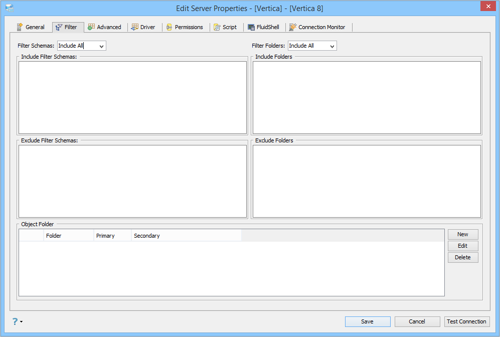 • Filter Databases/Schemas: Allows the user to specify the main schema browser filter for databases or schemas, on whether to include or exclude all.