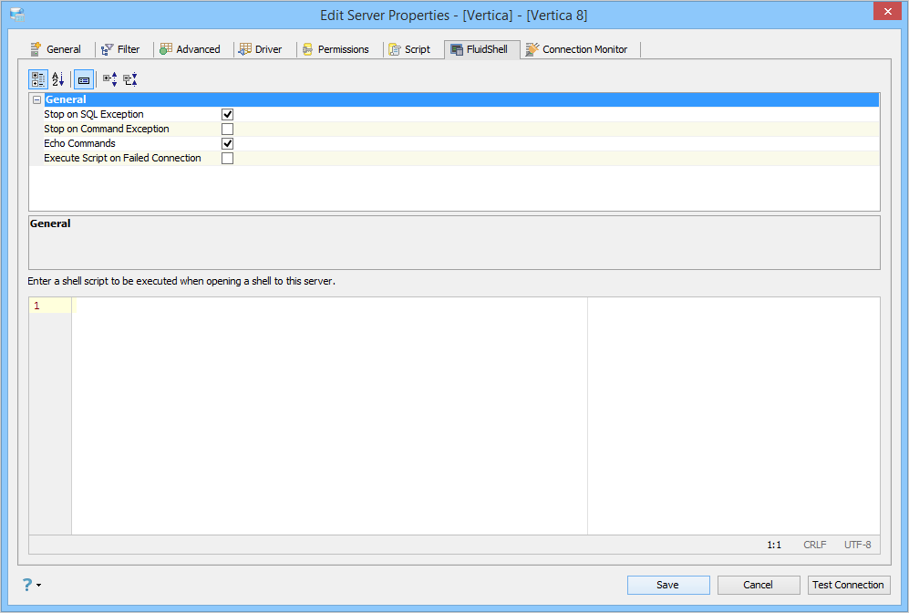 Edit Shell Scripts in Server Properties in Aqua Data Studio: