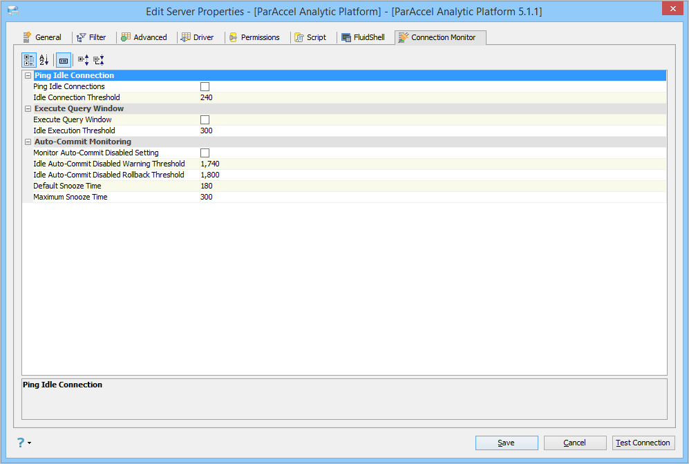 • Force Auto-Commit: When this option is selected, it sets auto-commit to TRUE for any Query Window to this server and disables the icons on the toolbar, regardless of the option in File > Options > Query Analyzer > [DATABASE] > [Auto Commit].