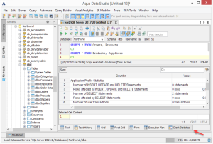 Client Statistics displays detailed statistics on the execution of the statement or script.