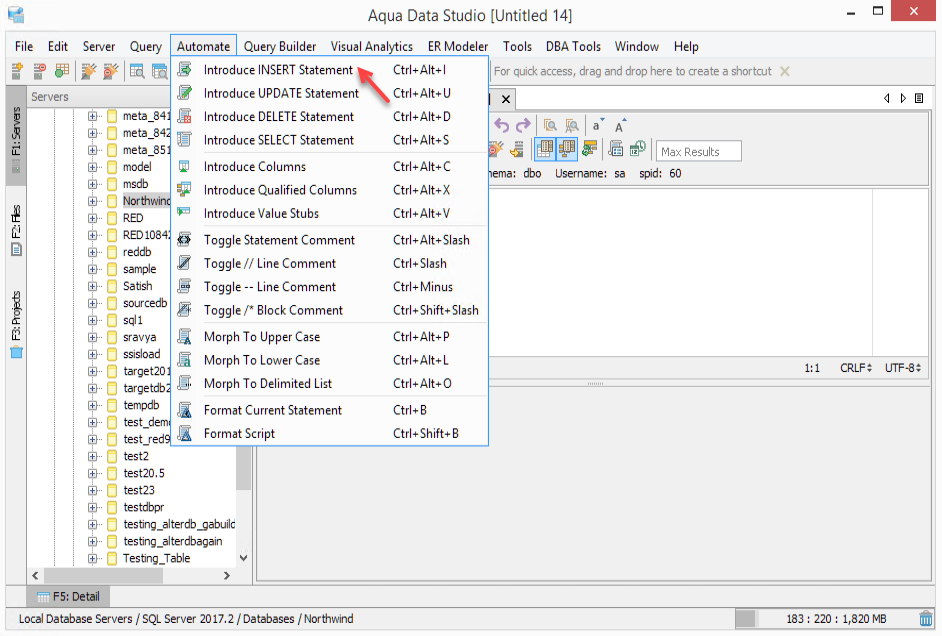 The SQL Automation features in Aqua Data Studio (the "Automate" pull-down menu) is to cut down on the number of keystrokes you make while writing SQL statements. Here is an example of how to automate the writing of basic INSERT statements with COLUMNS and value stubs.