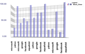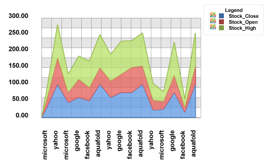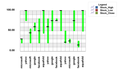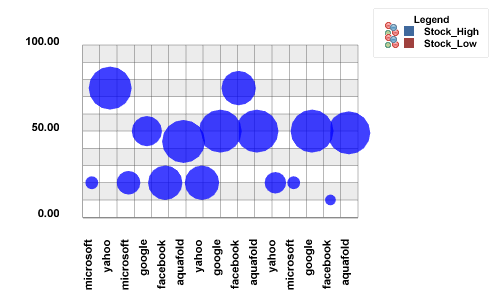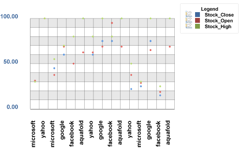The scatter chart in Aqua Data Studio allows you to create a chart showing one piece of information, such as stock value along the x-axis and another piece of information such as Company, along the y-axis. A scatter chart is used to map correlation between sets of numbers.