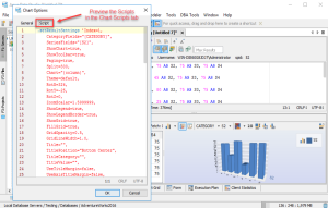 - Click on any one of the items and the chart script is generated together with the executed SQL. Script Full to New Window writes the script to a new query window.