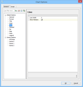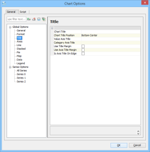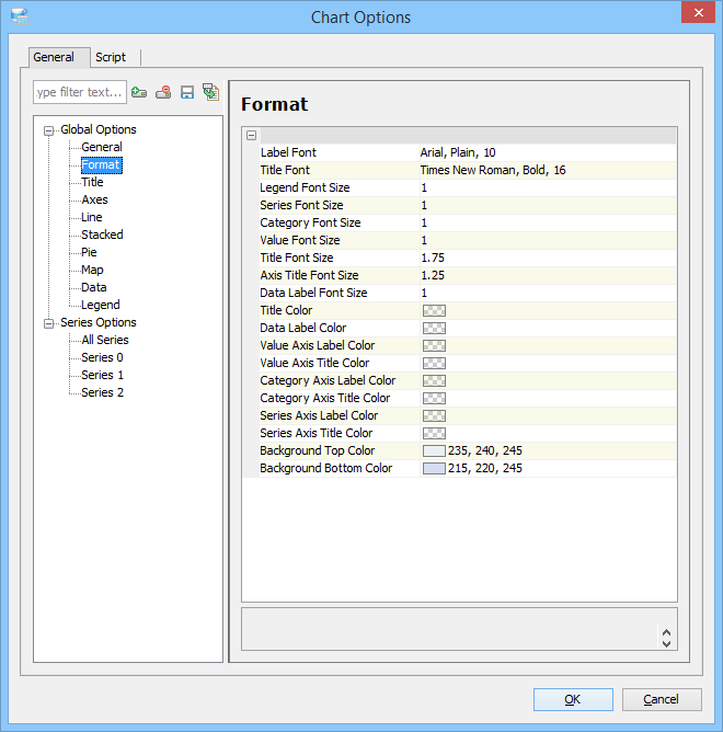 Chart Options for Aqua Data Studio contain a complete set of variables and values to alter the chart as needed, including background color, chart title, label distance, axis titles, category axis number format, and much more. Series Options (Advanced Chart Options) information is presented at the bottom of this page. It is possible to search the chart options using the field at the top left of the Chart Options Dialog. Any matching text found in an option section ( Format, Title, Axes, etc.,) option name or option description gets highlighted in the section and bold, to make it easy to locate where your search term has been found.