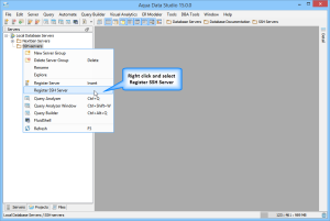 This is very similar to how database servers are registered. Once you have installed Aqua Data Studio you will need to register your servers before you get started. There are two methods of registering ssh servers, both of which launch the Register SSH Server dialog