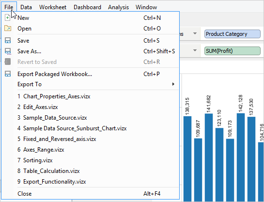 The [File] Menu allows creating a new Workbook, opening an existing Workbook, saving the current Workbook, saving as, exporting as a Packaged Workbook, and closing the current Workbook.