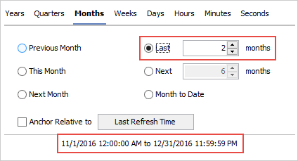 By default, Visual Analytics applies filters relative to the date and time you last refreshed or extracted data source. However, when you set a date in the Anchor Relative to field, Visual Analytics applies a filter relative to the specified date. For example, to analyze sales targets for the last 4 quarters ending on March 31st, 2016; switch the date unit to Quarters, set Last as 4 quarters, and set Anchor Relative to March 31st, 2016. Visual Analytics displays the sales targets from April 1st, 2015 to March 31st, 2016.