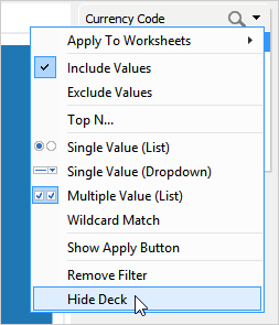 You can also hide a Filter Deck by clicking the triangle at the far right side of an individual Filter's Deck and choosing [Hide Deck].