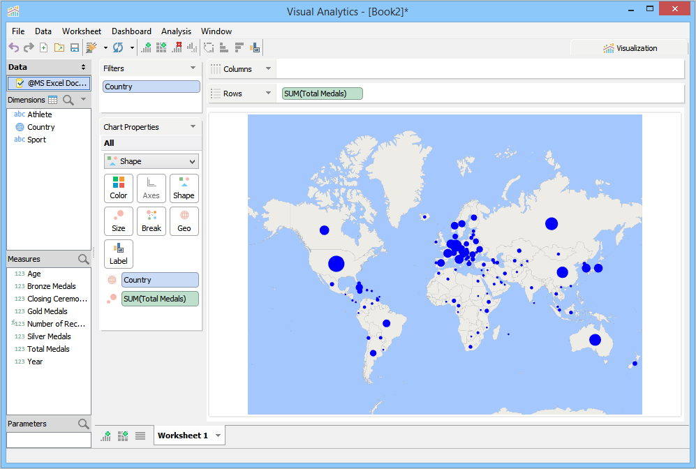 Geo visualizations are a user-recognizable way of displaying information relating to geography. Let's consider a scenario where you want to see the Olympic total medal tally for each Country. By using geographic visualizations, you can view the total medal tally count by country on a map.