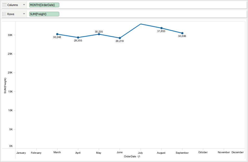 For example, the following view shows freight by order month. The actual data contains freight from March to September. However, using this option, you can set the axis range that starts from January and ends in December so you can see where the data points are plotted in the complete range. The icon is displayed for OrderDate because that is the range you have fixed.