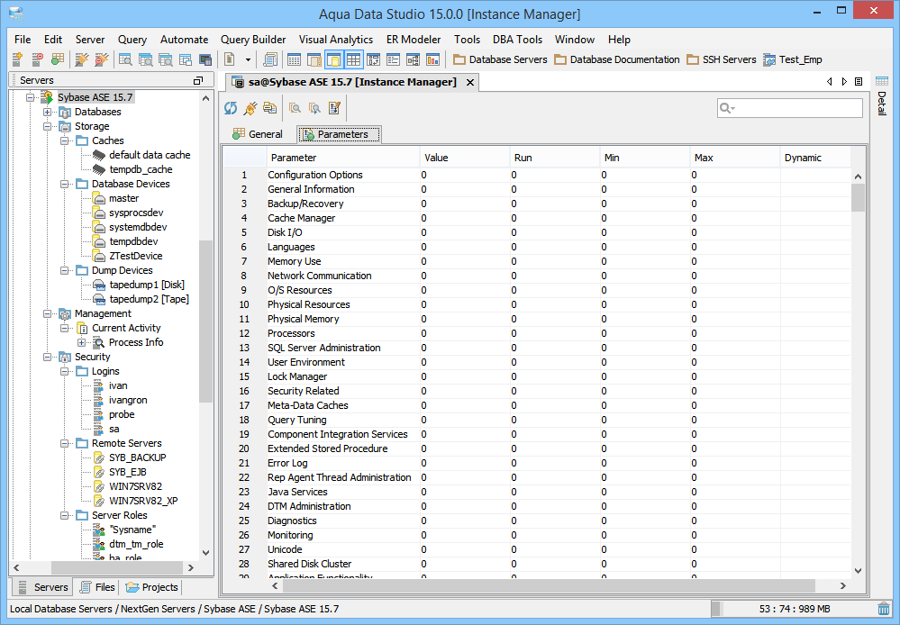 | Sybase Parameters Tab - Shows Sybase instance parameters Parameter: Name of the parameter Value: Value of the parameter Run: Current value Min: Minimum value of the parameter Max: Maximum value of the parameter Dynamic: Indicates whether the parameter can be changed during a session (dynamic), can be changed on the server restart (static) or not changeable (read-only) | |