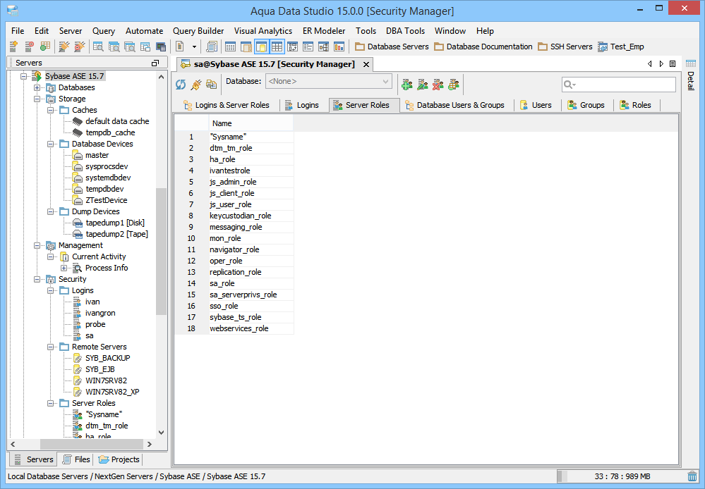 Server Roles Tab - Provides a list of server roles in the Sybase database
