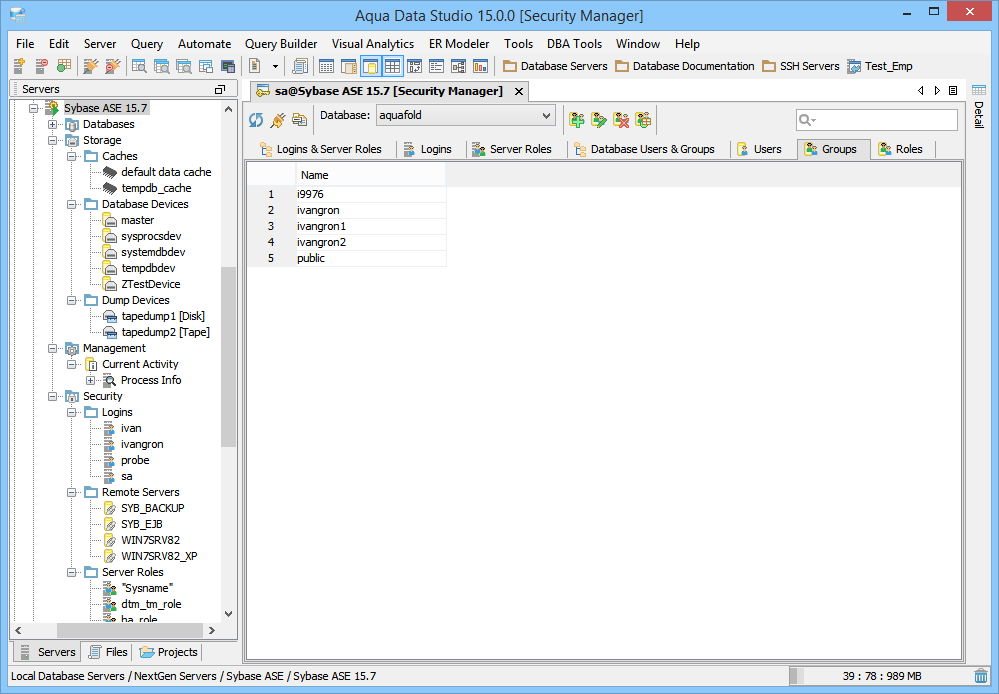 Groups Tab - Provides a list of roles (groups) in the Sybase database
