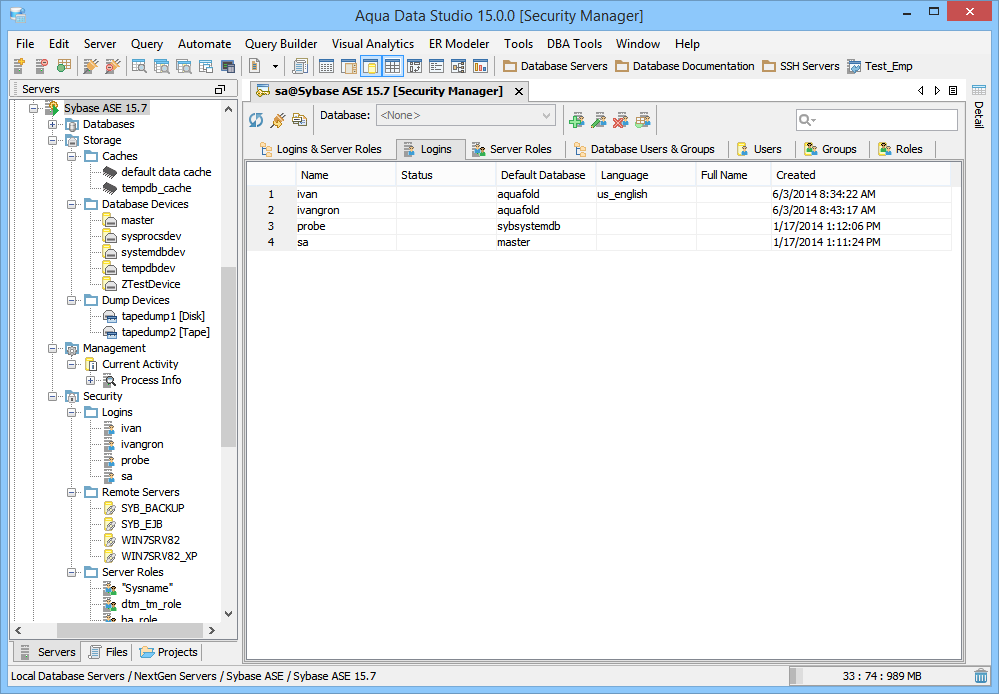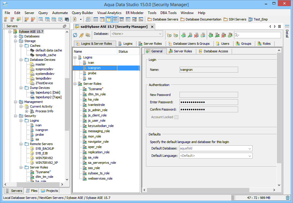 Logins & Server Roles Tab - Provides a tree display of logins and server roles the Sybase database. Selecting an object in the tree structure displays a detailed view of the object on the right pane.