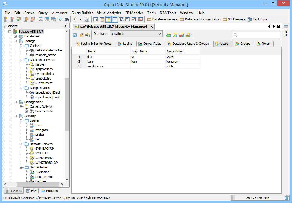 Database Users & Groups Tab - Provides a tree display of users and roles (groups) in the Sybase database. Selecting an object in the tree structure will display a detailed view of the object