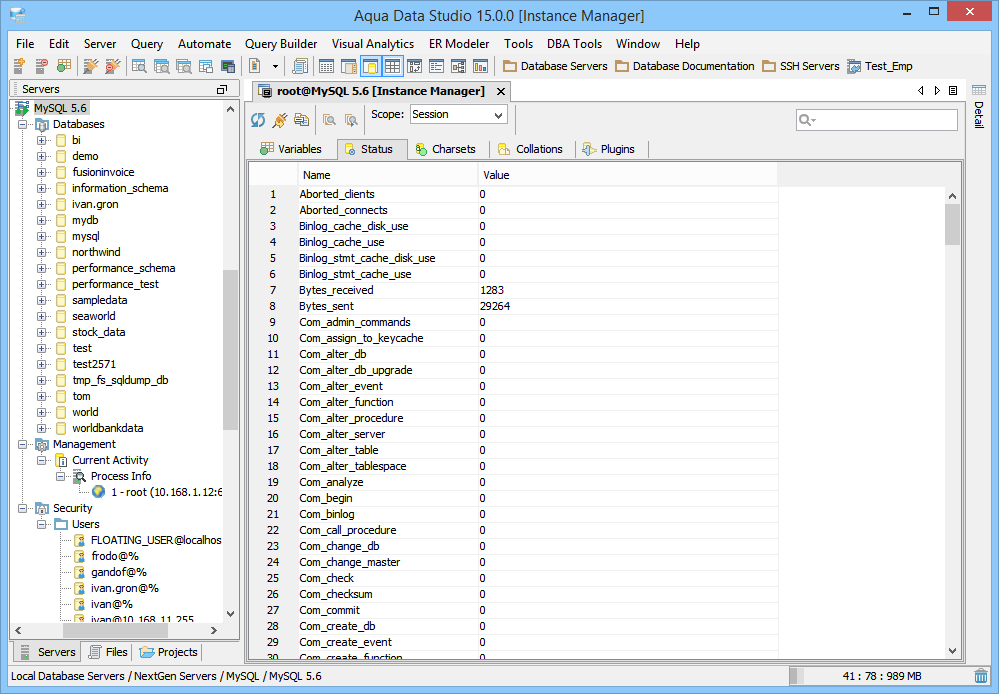 Variables Tab - Provides a summary of the MySQL instance Name: Name of the variable | |