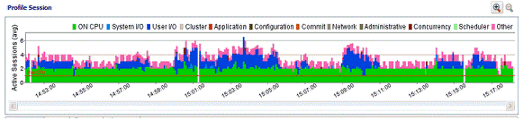 The Load Chart is designed as a high level entry point to profile session results. Subsequently, you can use the Top Activity and Profiling Details views to examine more detailed information on waiting and executing sessions over the length of the session. Alternatively, you can select one or more bars on the graph to populate the Top Activity section (and subsequently, the Details View) with information on a specific subset of the graph.