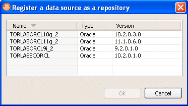 - In the Profile Repositories Preferences dialog, click Register. The Register a data source as a repository dialog appears and displays the managed data sources that may be used.