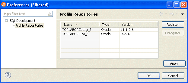 Use the Profile Repositories preferences to register and unregister supported version of Oracle data sources as profiling repositories. A data source must be added to the list of DB Optimizer Managed Data Sources before it can be used as a repository.