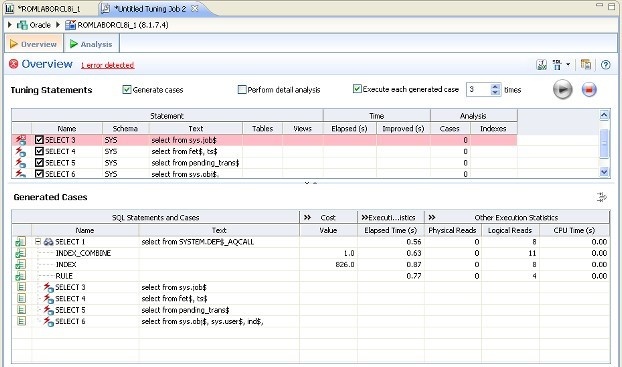 In the Generated Cases area of the Overview tab of a tuning job, the Cost and Execution Statistics columns let you compare the relative efficiency of SQL statements or statement cases. While the explain plan Cost for a statement or case is calculated when you add SQL to a tuning job, the Elapsed Time and Execution Statistics (and Other Execution Statistics columns, if available) columns are not populated until you execute that statement or case.