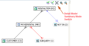 Click the Explain Plan toggle [], you can choose to view or hide the Explain Plan details. The additional nodes shown in the Explain Plan overlay provide details on the flow of the query plan, with operations (such as nested loops, sorts, and joins) showing connecting tables and other operations. Hover the mouse over the objects or relationships to view additional details.