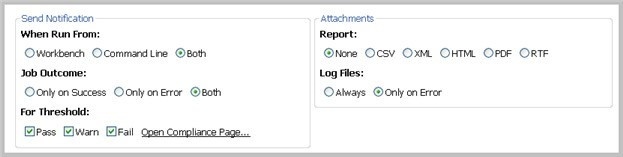 - The When Run From option specifies that email notifications are sent depending on where the job is initiated. By default, notifications are sent when you use either the Workbench or Command Line.