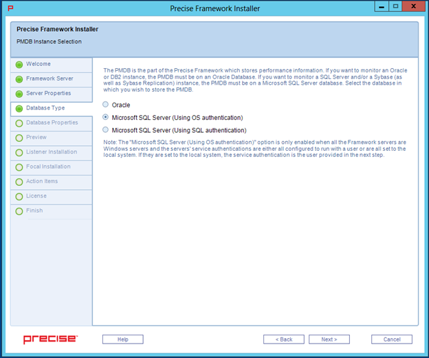 The Database Type tab allows you to select the PMDB for the Precise framework.