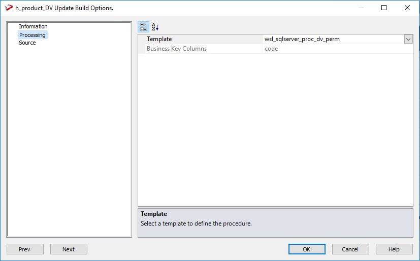 2. On the Processing tab of Table Update Build Options screen, select the template to use from the Template drop-down or use the previous update procedure template.