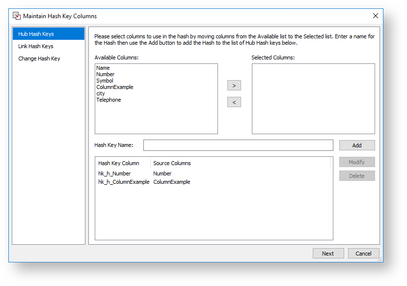 This Wizard is launched when building a Stage table with Table Type of Data Vault Stage. It enables you to specify the source columns to be used in defining the Hub, Link, and Change hash key columns.