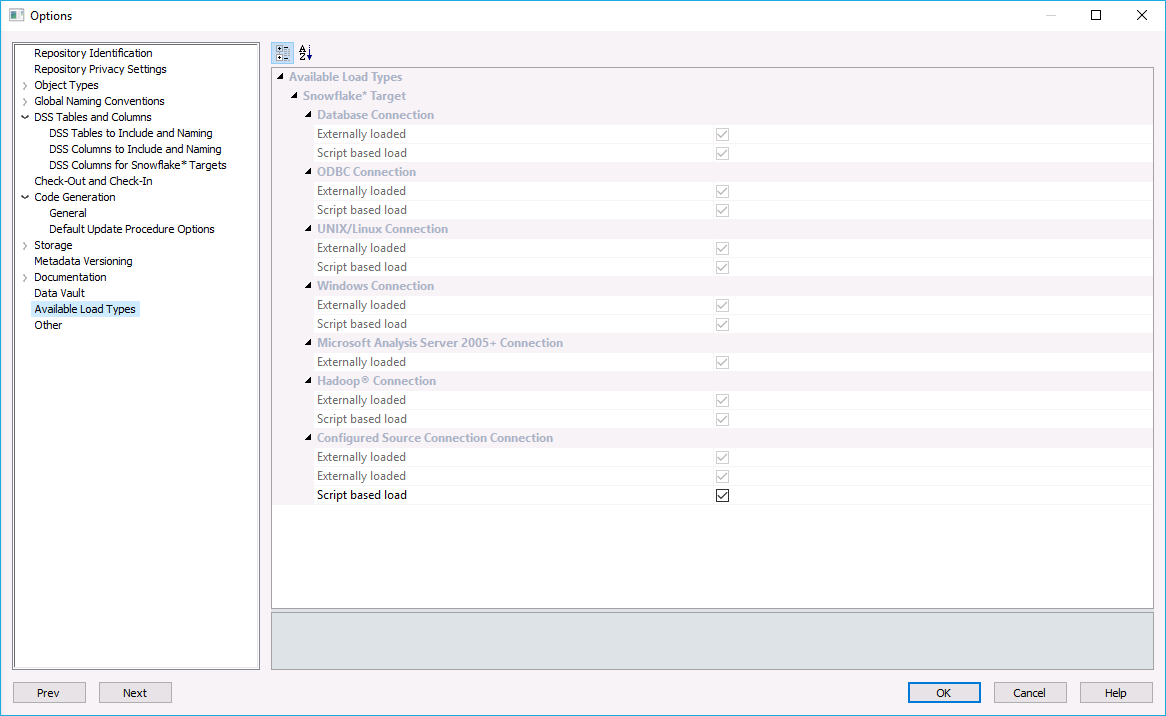 Select from the combination of load types supported by target and source databases, to control the default load type options that can be set by users from the Connection and the Load table Properties window.