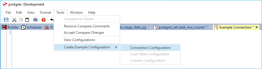 - Empty the default script to enable the examples menu in the editor. Select Tools>Create Example Configuration>Connection Configuration