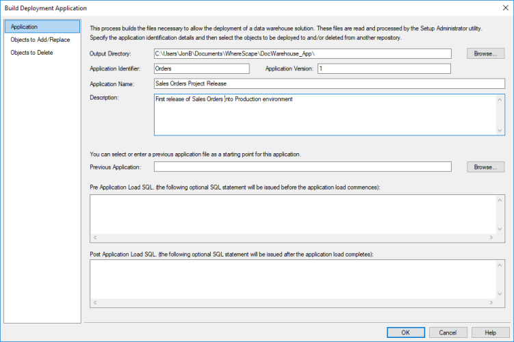 - The Build Deployment Application window is displayed which enables you to specify the application identification details and optional previous application to be used as a starting point, and pre and post-application load SQL statements to execute; if required.