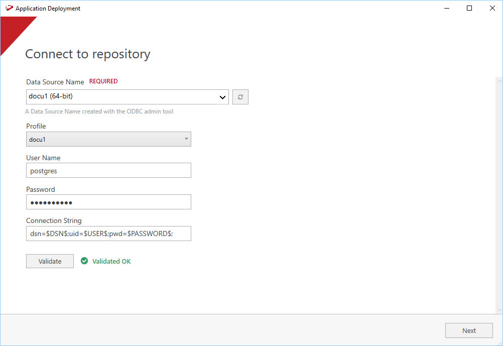 Type in the required metadata connection details:Field Description Data Source Name The ODBC data source name (DSN) for the metadata repository connection. Username The log-in user name to connect to the metadata repository connection. Password The password for the specified user name. - Click Validate to continue the data source and login credentials validation.