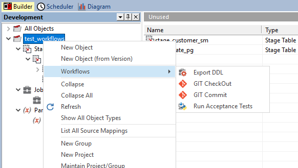 Workflow scripts, when defined, will appear in the context menu throughout the RED UI.  When clicking on them in any context menu, the underlying script will be executed and provided with the complete object list contained by the context. This allows for integration scripts to be written that can perform actions on lists of objects, such as: creating deployment applications, checking items in and out of GIT, running external tests on the objects selected, exporting data to catalog tools, backing up scripts to disk and more!