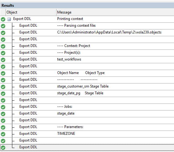 In the example results below the Export DDL script contained the example 'Print Context' script from the Workflow scripts section of the documentation.