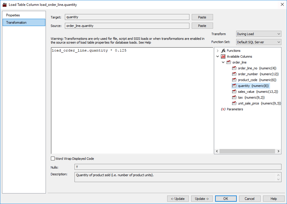 For example, we could have a transformation of 'load_order_line.quantity * 0.125' to calculate a tax column of 12.5%. Click the Transformation tab to enter a transformation.