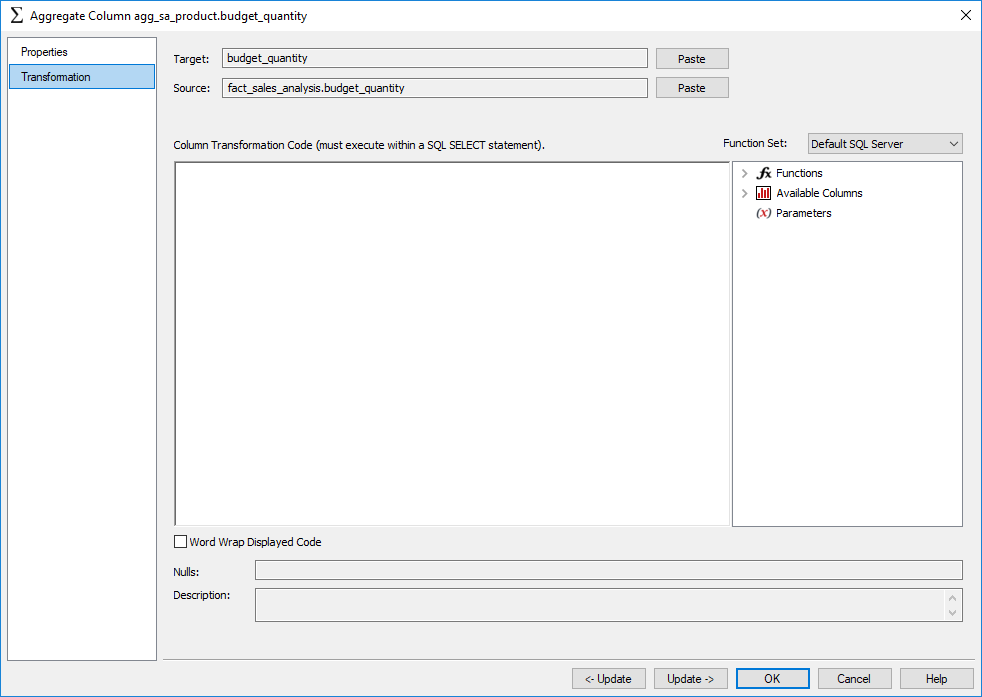 Each aggregate table column can have a transformation associated with it. The transformation will be included in the generated procedure and will be executed as part of the procedure update. The transformation must therefore be a valid SQL construct that can be included in a Select statement. For example, we could have a transformation of 'load_order_line.quantity * 0.125' to calculate a tax column of 12.5%. Click the Transformation tab to enter a transformation.
