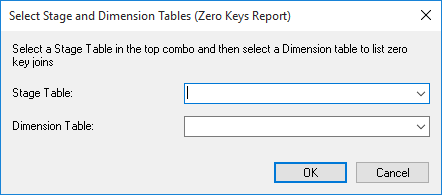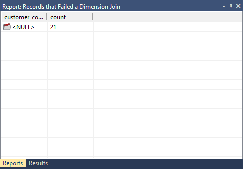 This report shows the dimension business key(s) that could not be found in a specified dimension when a specified staging table was last updated. This report will show null values, blank values, and business keys not found in the dimension.
