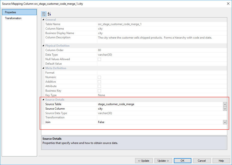 The Source Details table column properties is used to specify where to obtain the source data and provides options for processing (transformation and join settings) the source data. You can also define and manage column source mappings from this screen.