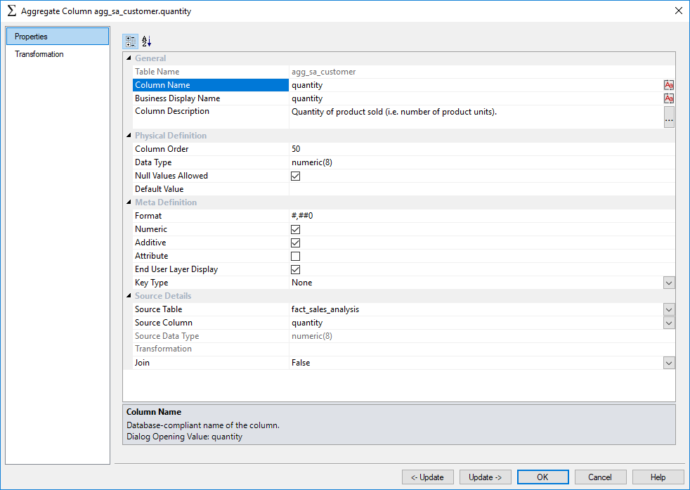 Each aggregate table column has a set of associated properties. The definition of each property is defined below: