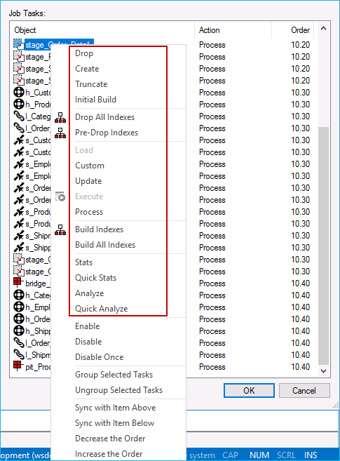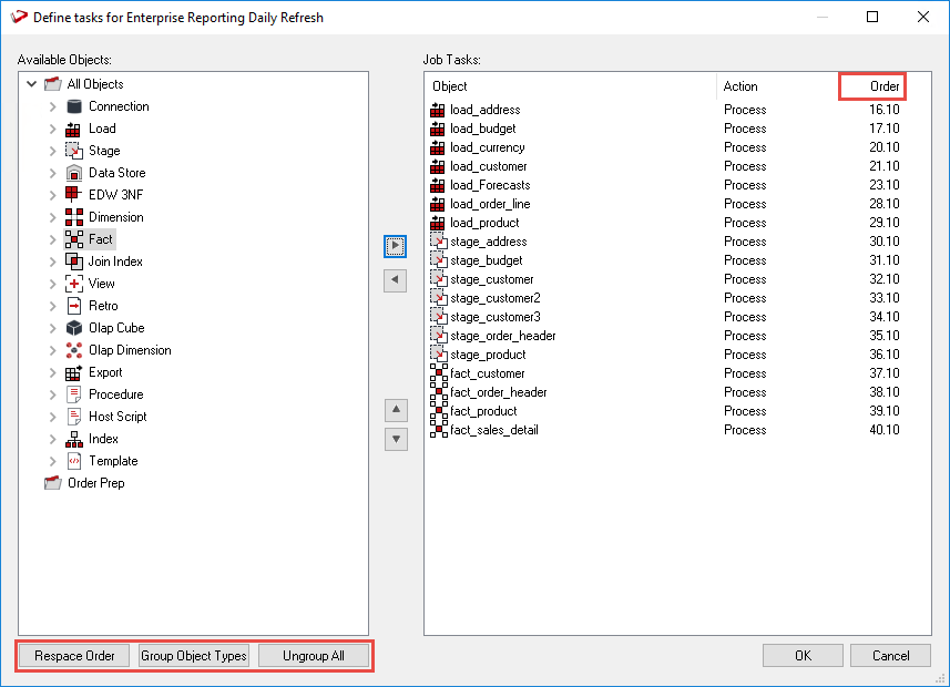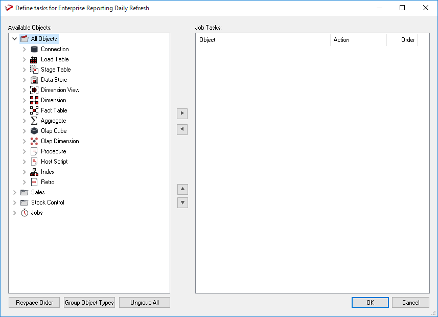 Double-click an object in the left pane to add it to the task list in the right pane. Normally objects, such as Load or Fact tables are scheduled rather than procedures.